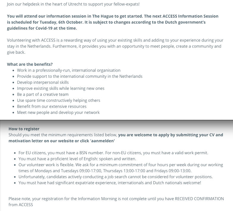 Well into its 32nd year ACCESS has become synonymous with outstanding personalised service, empathy and insight. All ACCESS volunteers, trainers, counsellors, Dutch or international, have been expatriates themselves and know first hand what the extra hurdles are to living away from a familiar environment. They add value to what we do, and how we do it. Just as importantly, they do so voluntarily – generously giving their time, sharing their unique skills, experience and diverse cultural backgrounds.